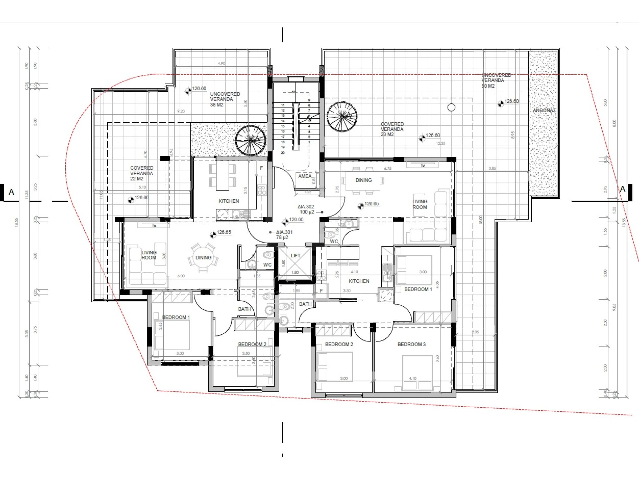 Penthouse apartment no. 302 comes with 3 bedrooms, a bathroom and a guest w.c., a covered parking space & private storage room, 100sq.m of net internal covered areas, massive 49sq.m covered verandas plus huge 73sq.m of uncovered verandas on the 3rd floor. There’s also the private roof garden with 24sq.m covered area including another bathroom plus another 15sq.m of uncovered area.
