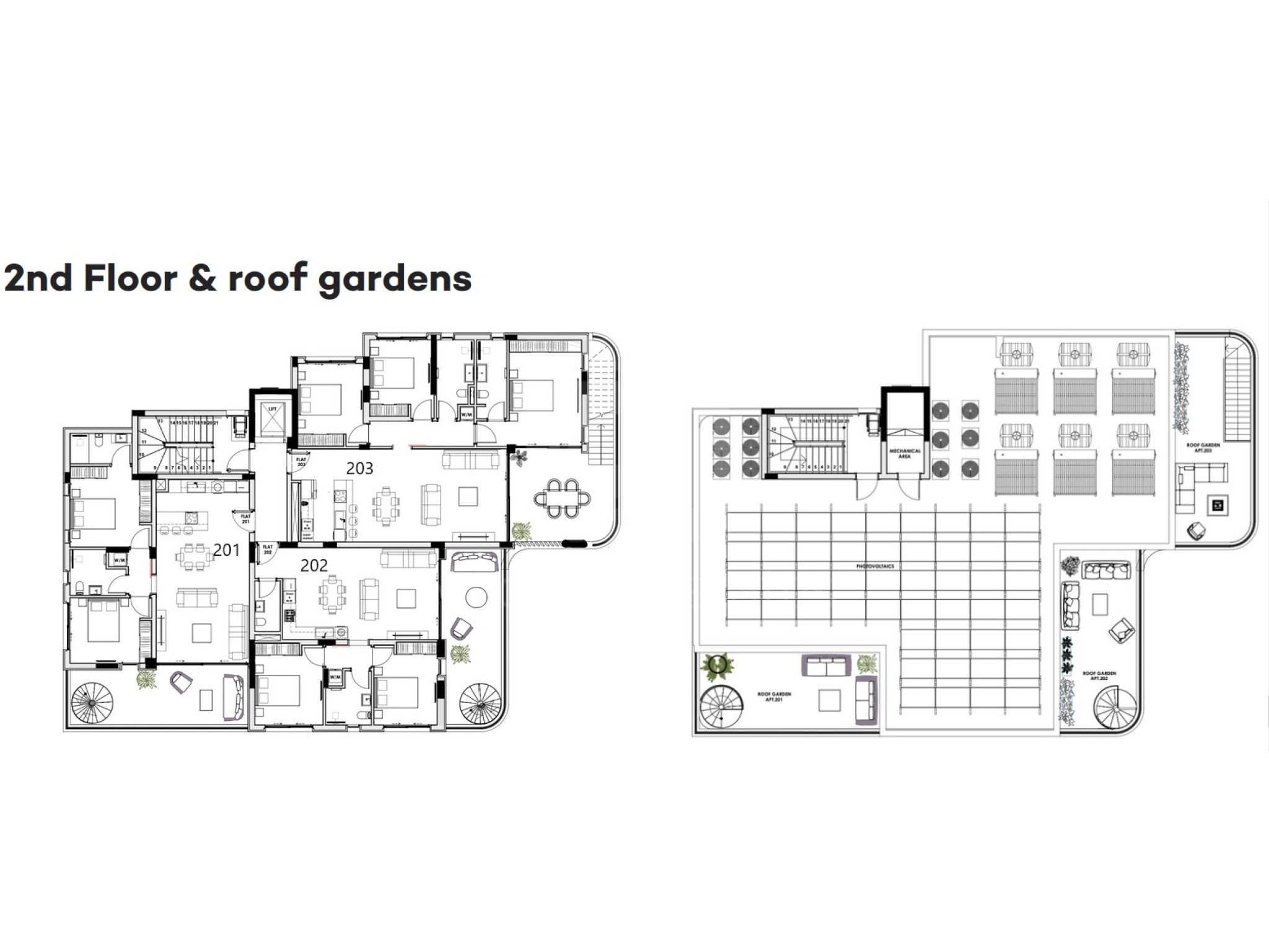 Penthouse Apt. no. 201 is on the second floor and it comes with 2 bedrooms, 2 bathrooms, 95sq.m! of internal covered areas, 24sq.m covered veranda plus 32sq.m of private Roff Garden, 1 covered parking space and a 5.5sq.m of private storage. Price is 630000 euro plus VAT