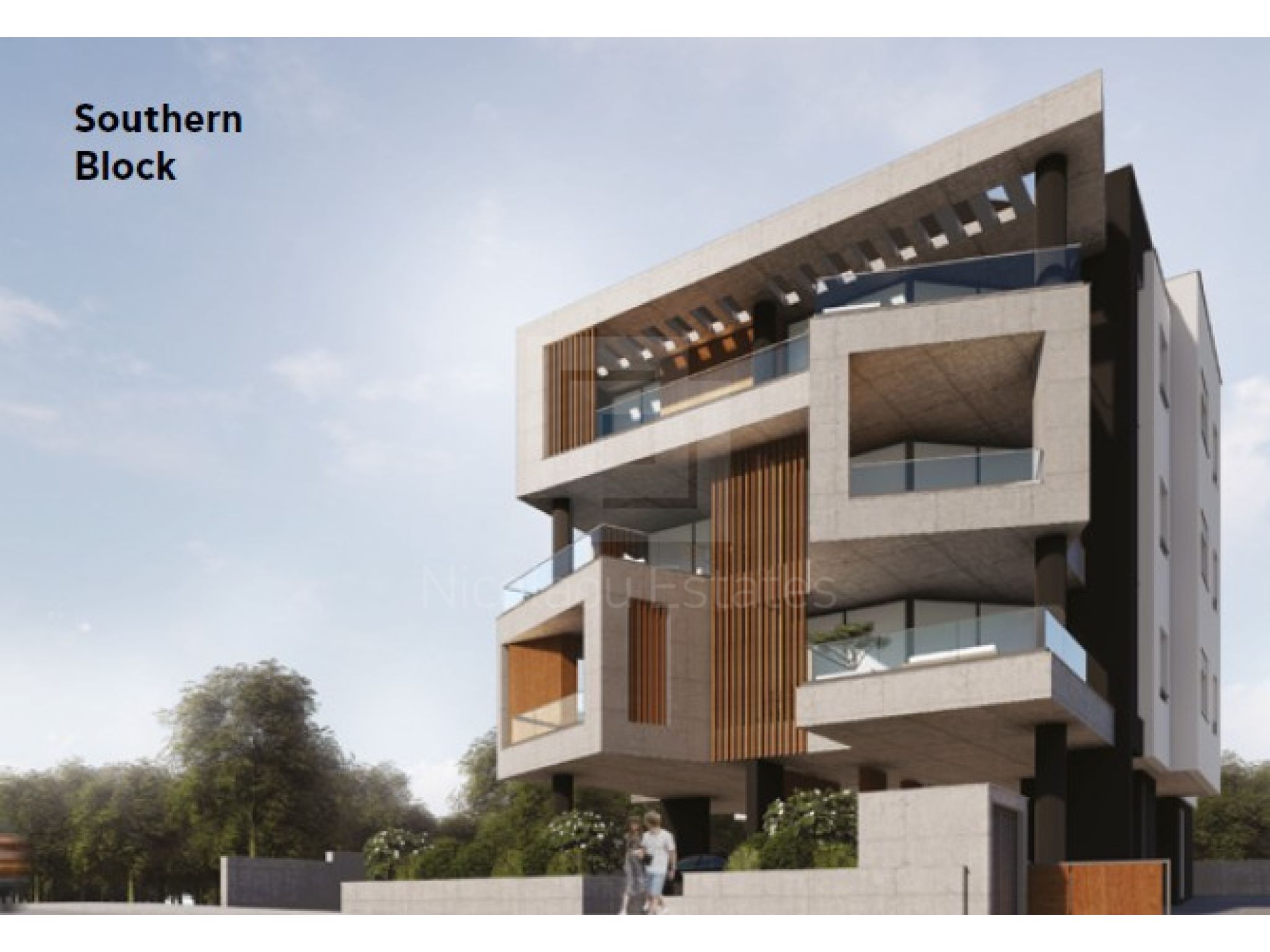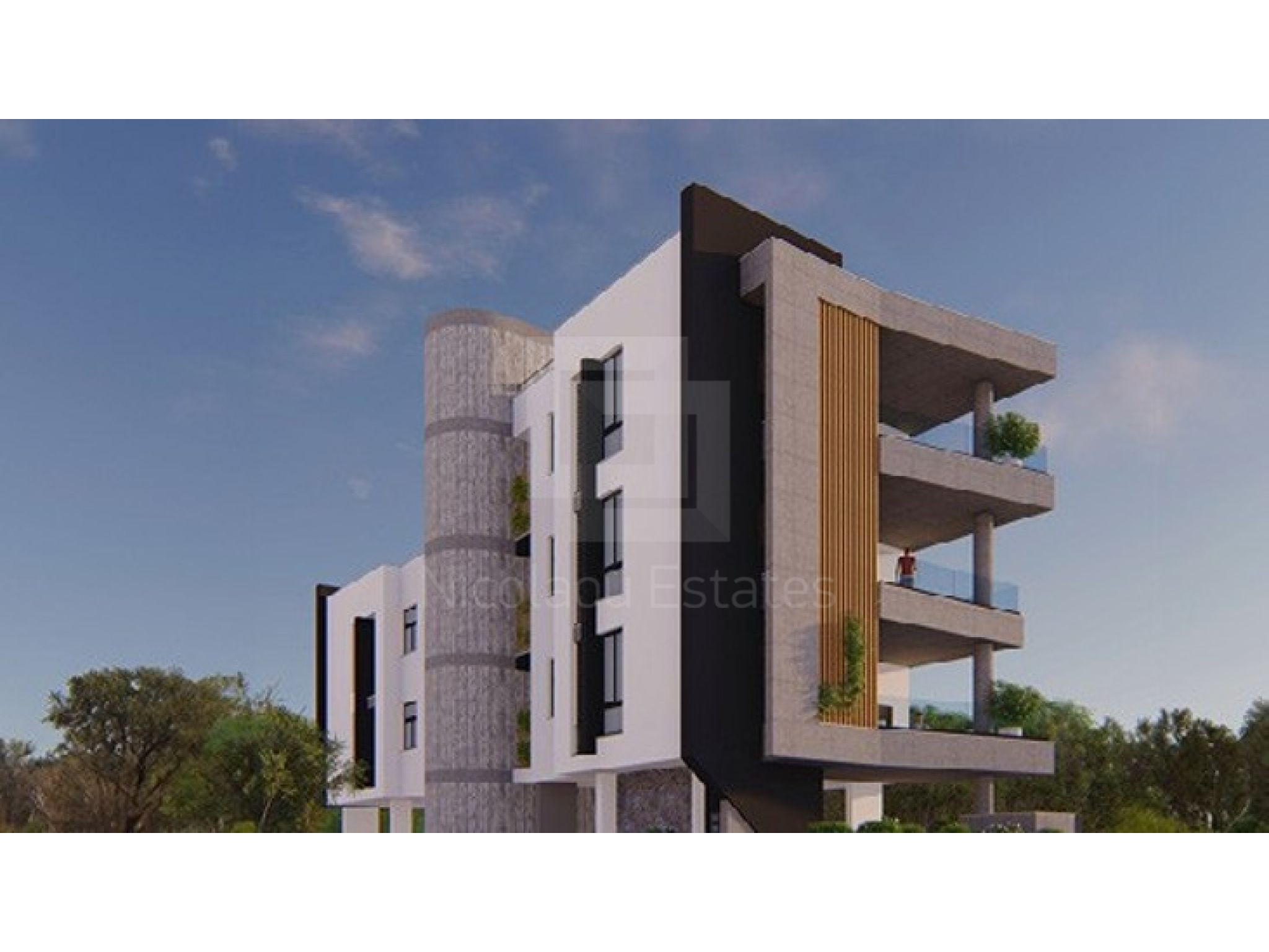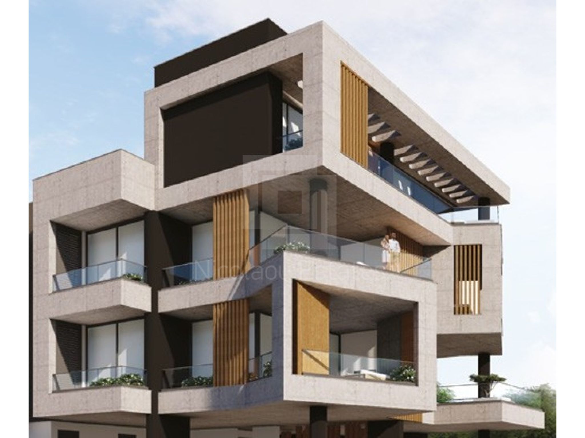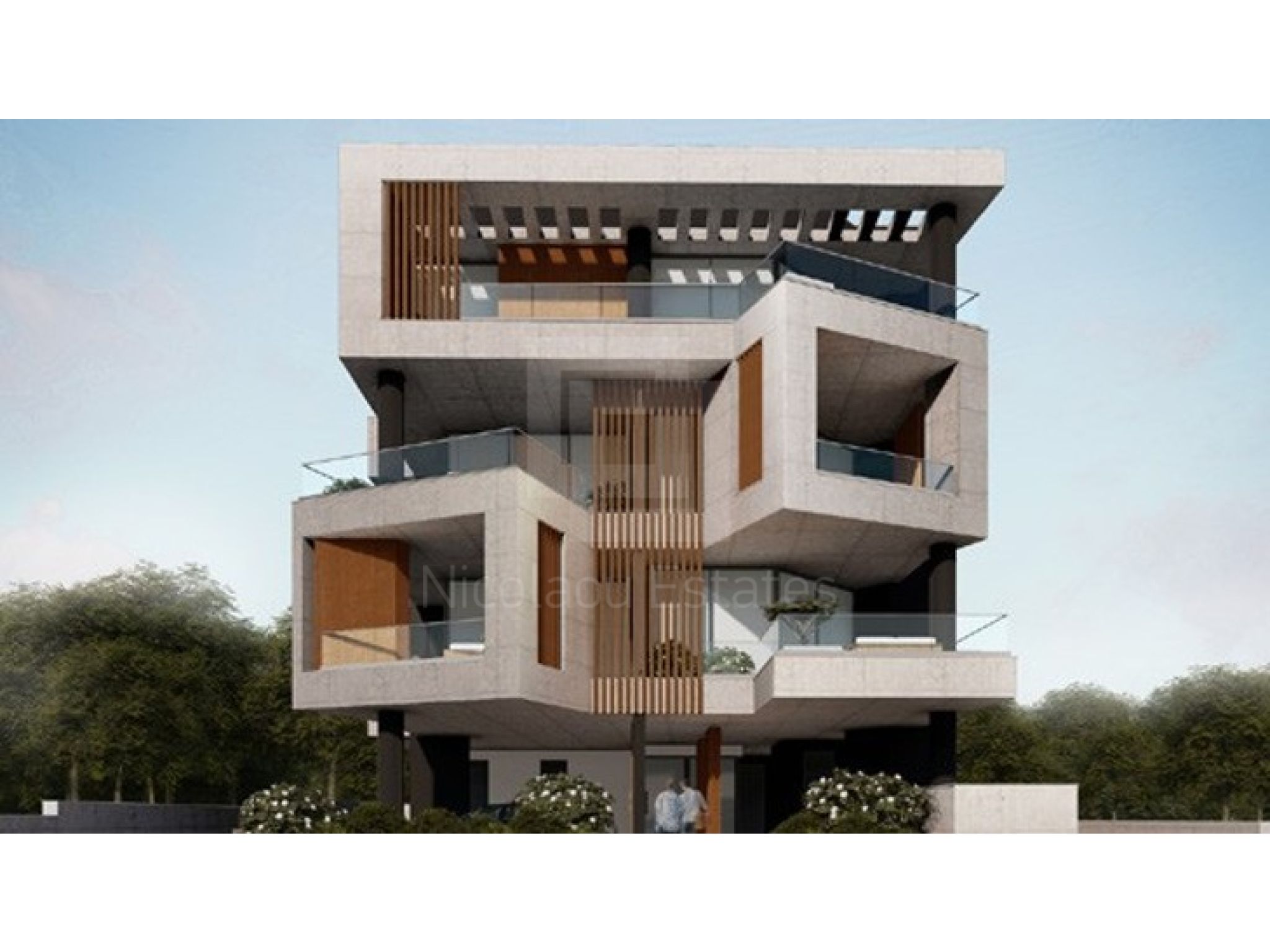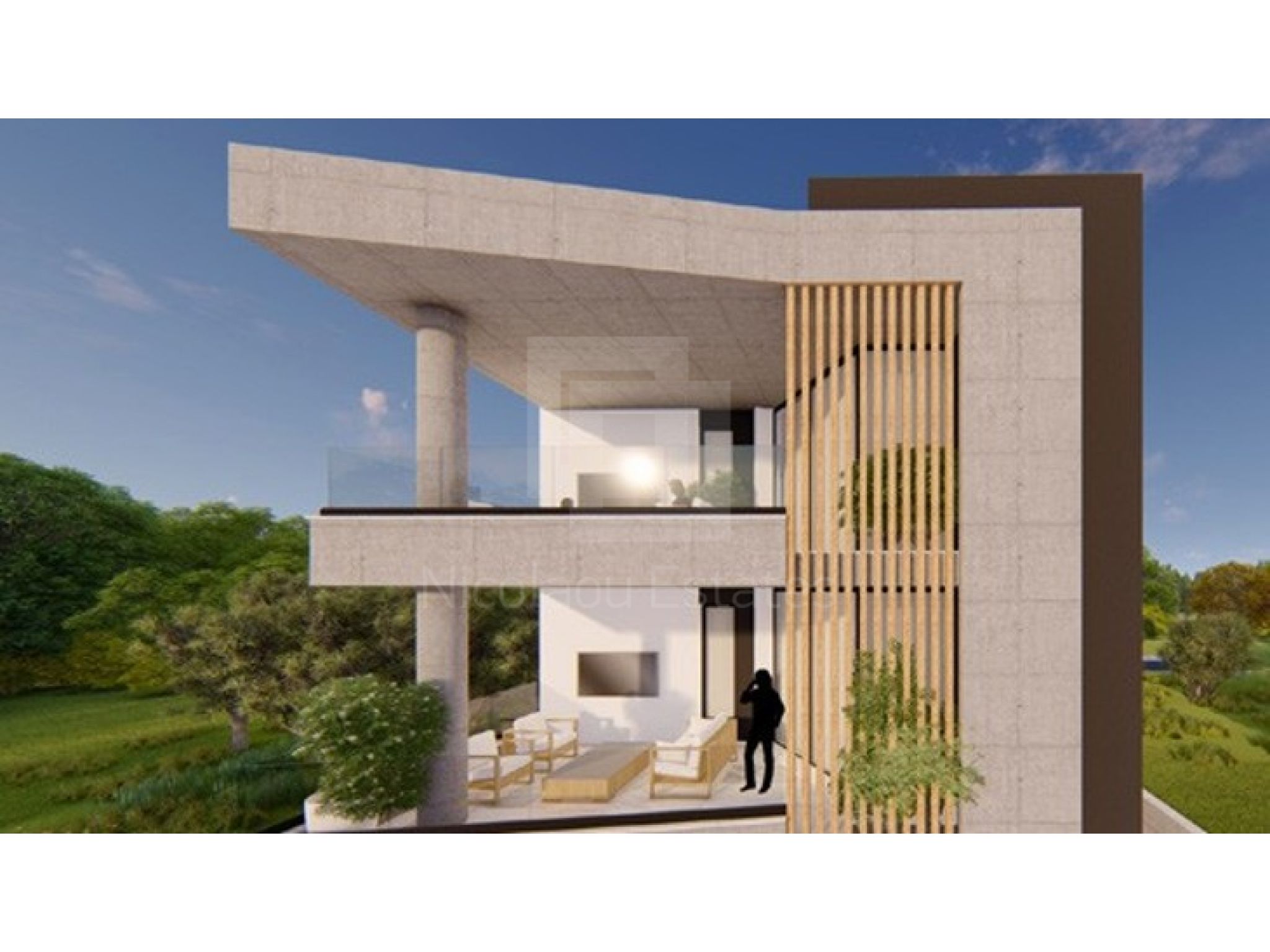 Contemporary architecture—clean white volumes, warm wood and glass.