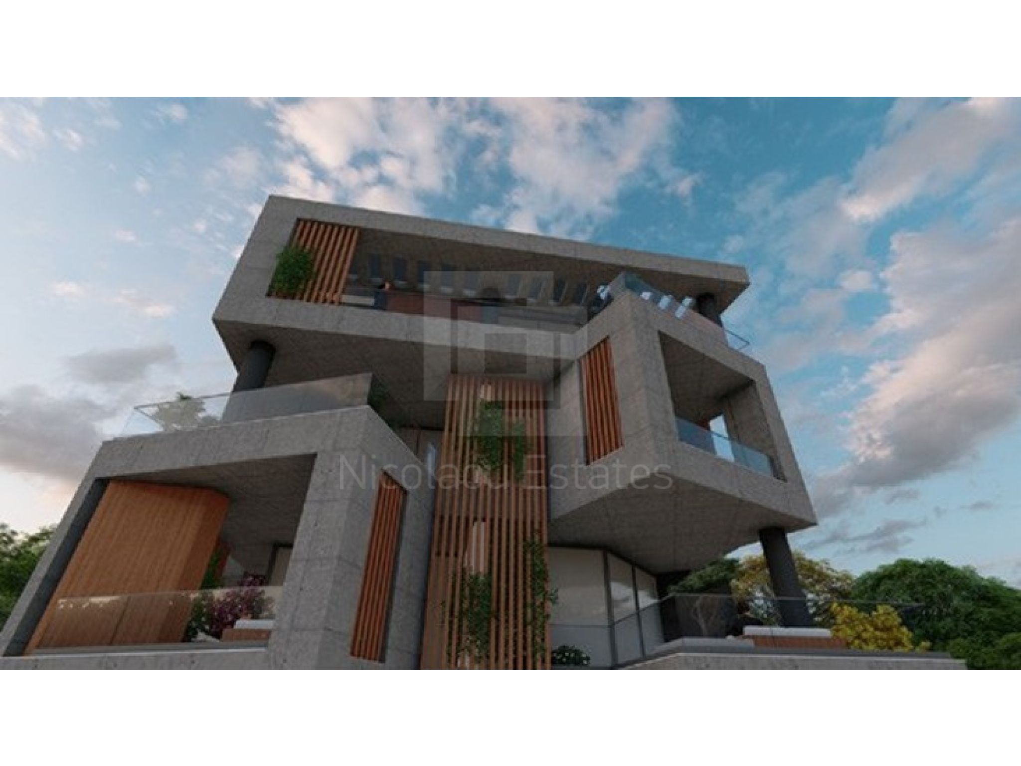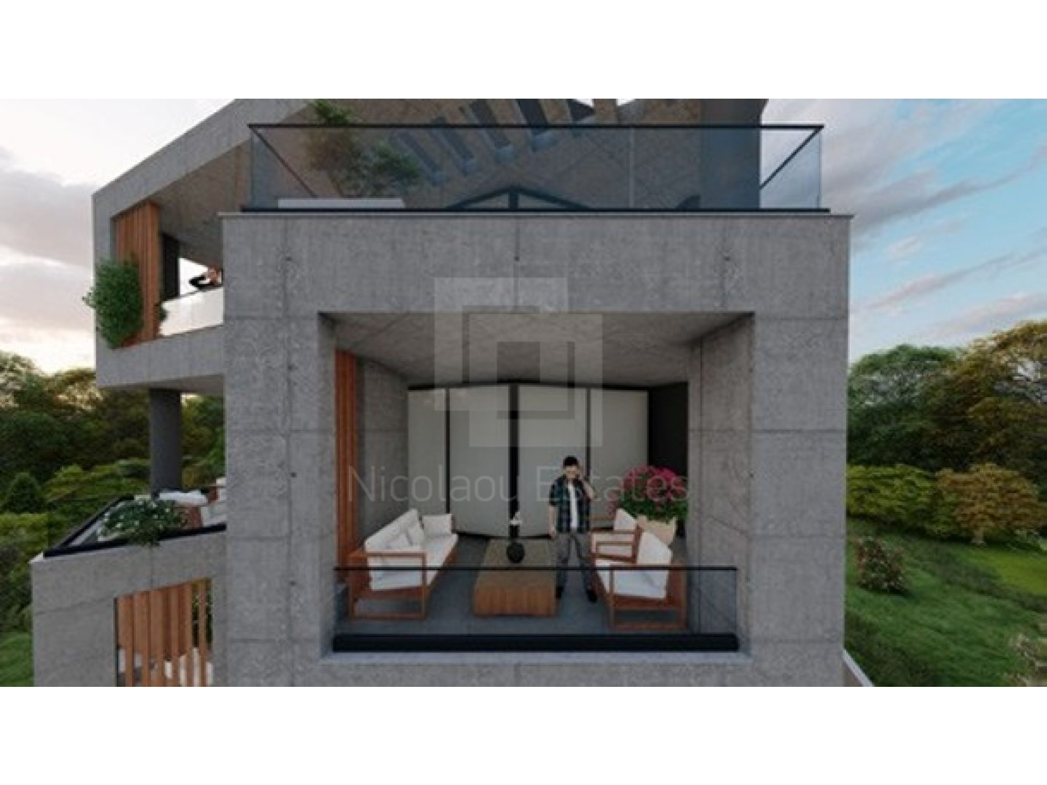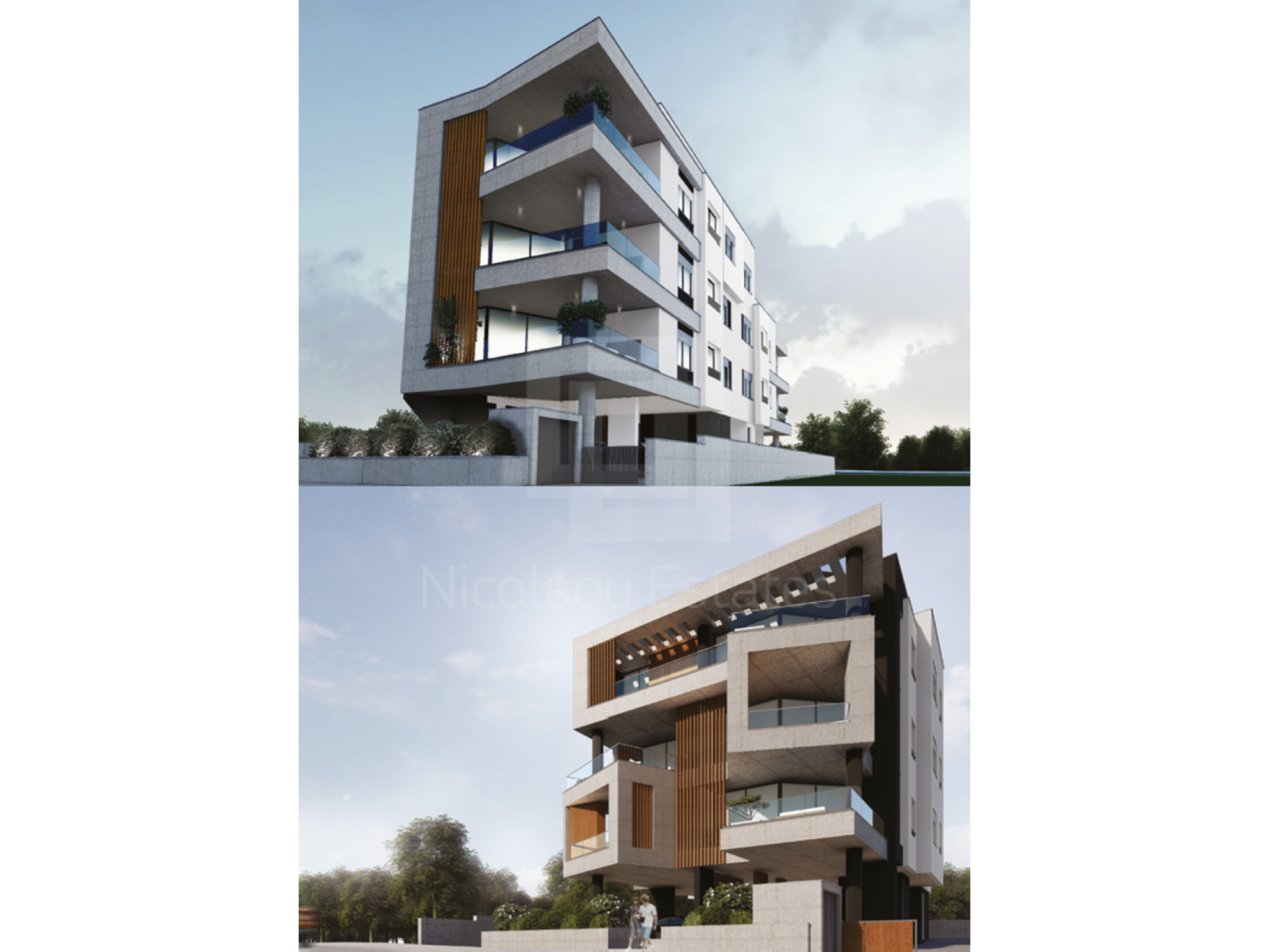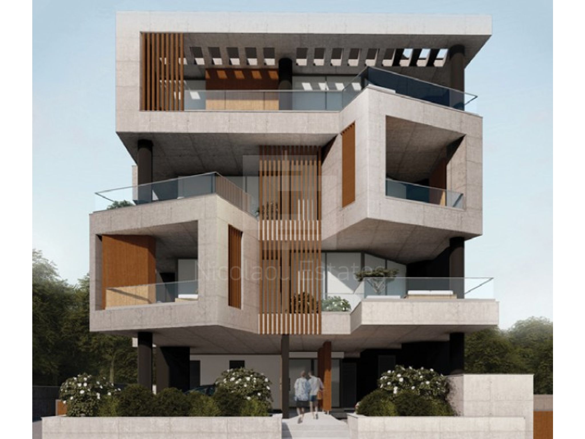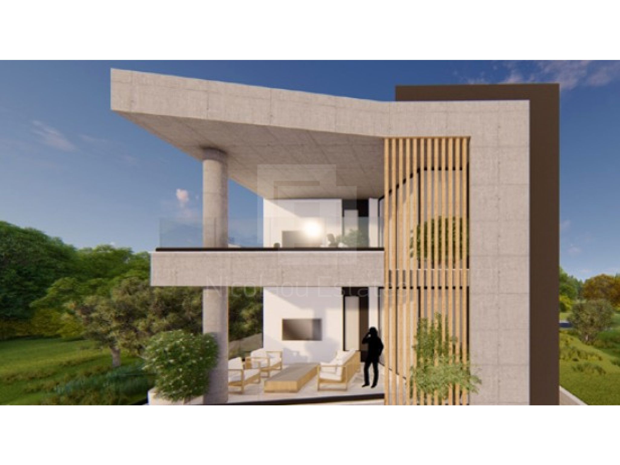 Contemporary architecture—clean white volumes, warm wood and glass.